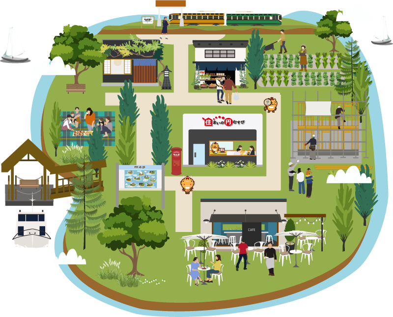九州の真ん中に位置する熊本。山、川、海の自然と都市が調和したこの県に、これからのサスティナブルな世界を実現するためのリゾート地「VRアイランドセンター島」が誕生しました。この島には思い思いの暮らしを実現する家が集り、町が形成されています。センター長の「くまどん」には理想の家づくりを実現したい家族からの相談に大忙し。実際の展示場に居るような感覚で巡ってみてください。
